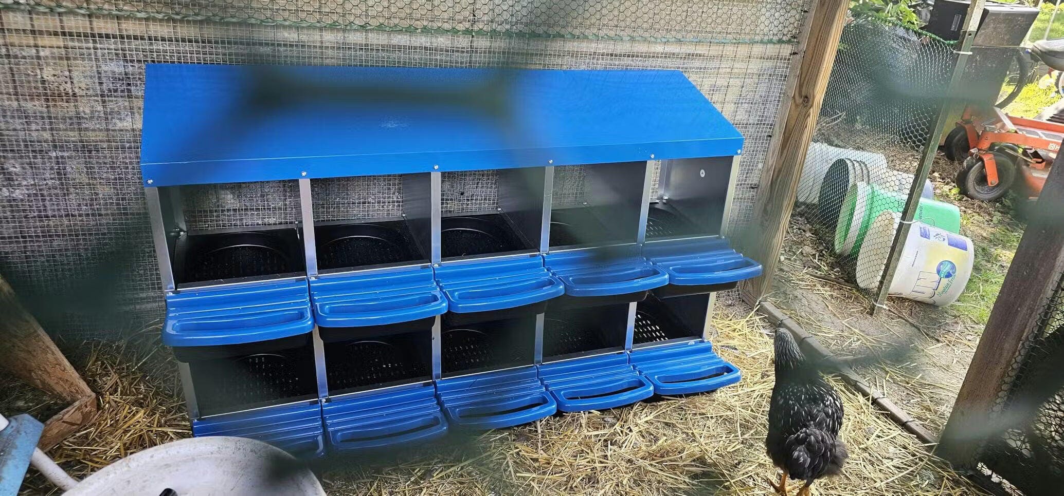 Ensure the nesting box is level for optimal roll-out performance. Adding nesting pads can improve hen comfort and keep eggs even cleaner.